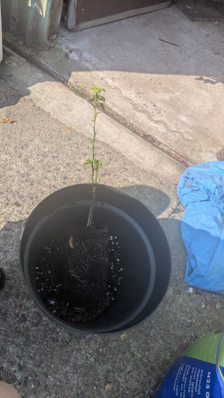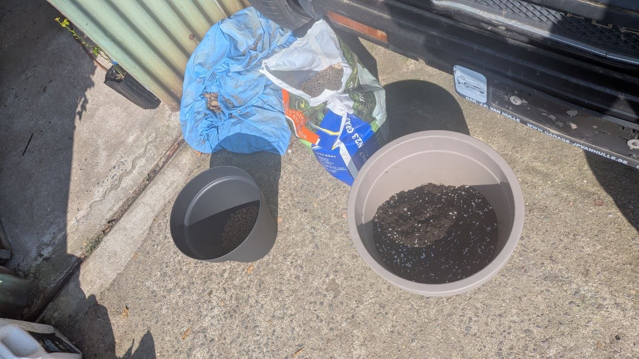 22 maart 2026: de eerste groeier apart gezet in potgrond met bodemverbeteraar, perliet en stikstofkorrels door gemengd